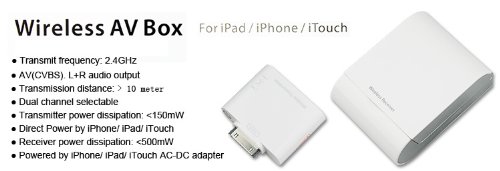 This sale is for a wireless av video output transmitter box which is suitable Apple iPad, iPhone and iPod Touch. This wireless av video box is ideal as it supports dual channels selection, and you are able to watch videos without the need of having m